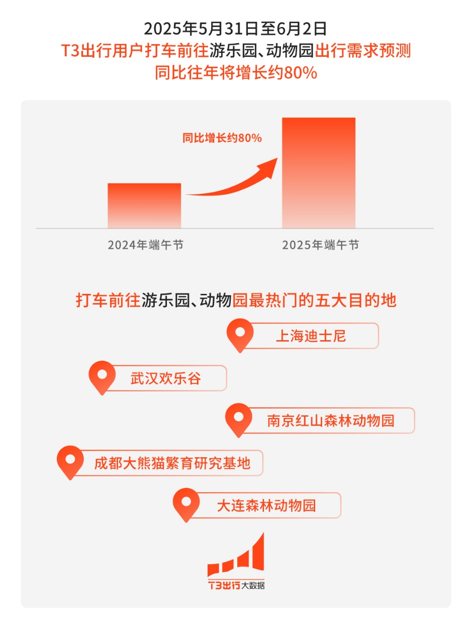 今年端午节第二天恰巧是儿童节,带着孩子出游,游乐园、动物园是必不可少的去处。据T3出行数据预测,5月31日至6月2日期间,用户打车前往游乐场所、动物园出行需求量同比将增长约80%。
