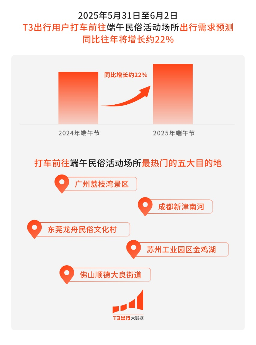 居民对端午传统习俗的热爱也将体现在出行中。据T3出行大数据预估,5月31日至6月2日期间,用户打车前往端午民俗活动场所的出行需求量同比将增长约22%。